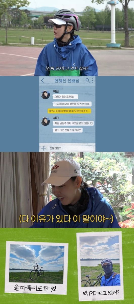 영상 속 어느 날 한혜진은 유튜브 스태프에게 “자전거 타야죠. PD님. 아침에 몸무게 쟀는데 57kg 넘음”이라고 1000칼로리를 태울 55km 자전거 타기를 제안했다.