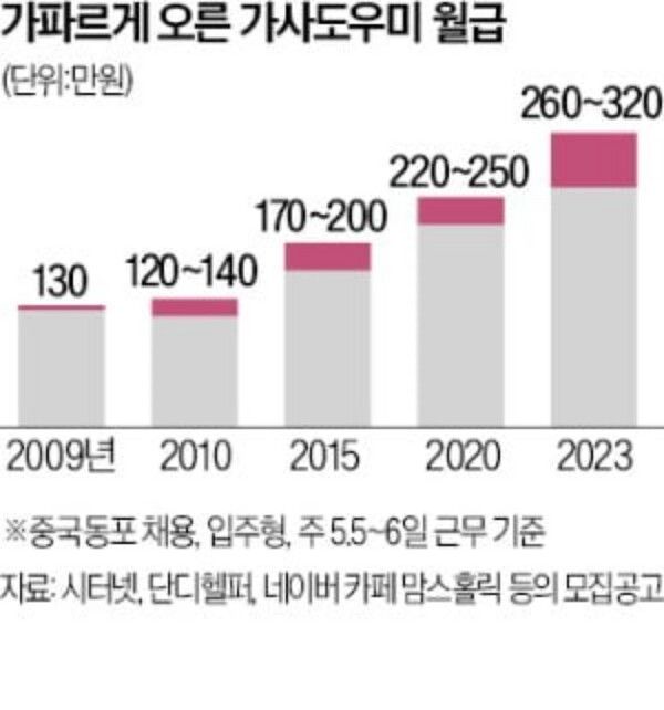 현재 가사도우미의 월급은 한국인의 경우 300~400만 원, 중국 동포의 경우 200만 원 중후반대로 책정이 되어 있다.