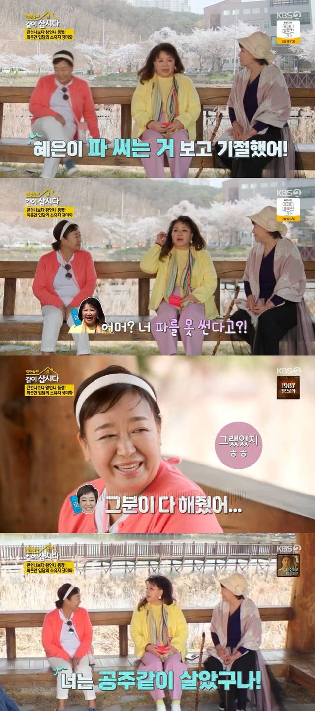 방송에서 파를 못 써는 혜은이의 모습을 보고 깜짝 놀랐다는 장미화는 김동현이 다 해줘서 진짜 파를 못 썬다는 혜은이의 말을 듣고는 "어머, 너는 공주같이 살았구나! 나는 밥하랴, 설거지하랴, 애 키우랴, 돈도 갚아줬는데 했더니 혜은이가 언니 그게 다는 아닌데 했다"고 전해 모두를 폭소케 했다.