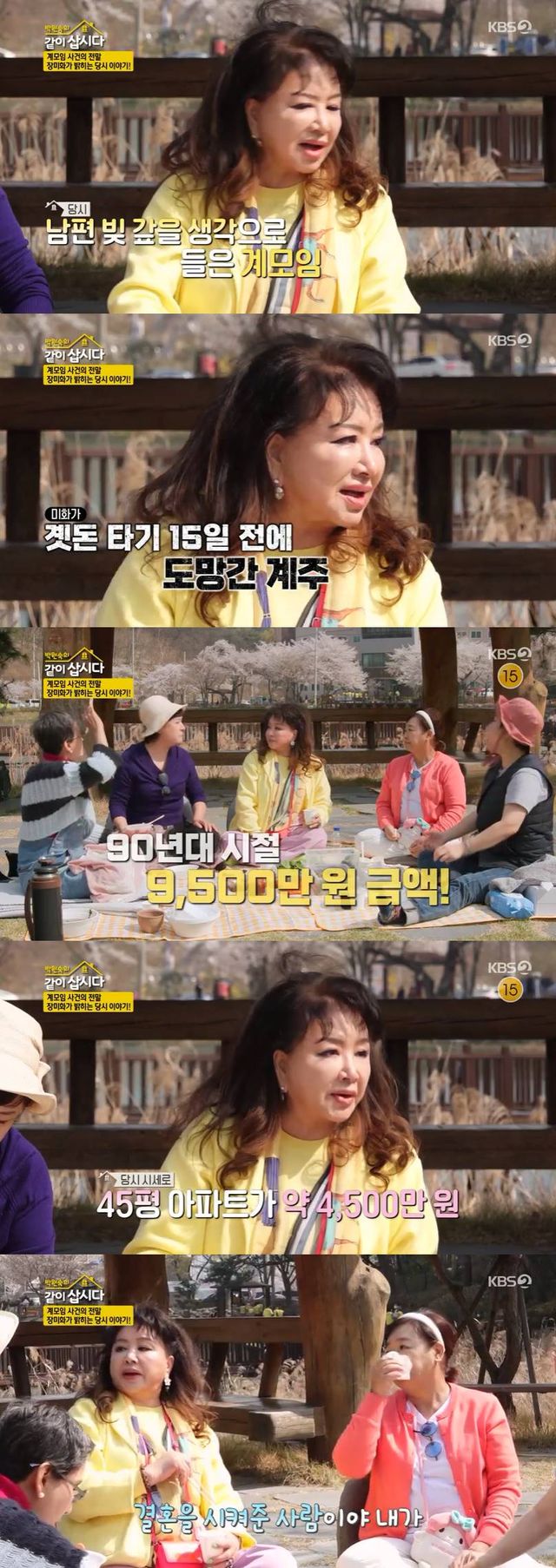 전남편의 빚을 갚기 위해 계모임에 들었지만 곗돈을 타기 15일 전, 당시 아파트 두 채 값을 넘는 돈인 9500만원을 날렸다고 밝혔다.