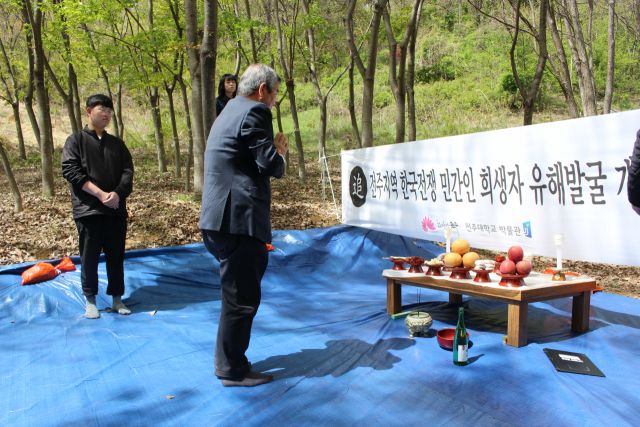 지난 4월 12일 황방산 기슭에서 조촐한 유해 발굴 개토제가 열렸다. 김승수 전주시장이 참여했던 기존 개토제와 달리 현 전주시(우범기 시장)에서는 담당 공무원만 나와서 자리를 지켰다. 나무를 벌채해서 흙바닥이 휑하니 드러난 발굴 대상지를 바라보며 차려진 제상 앞에 유족들과 전주대학교 박물관 발굴팀이 둘러섰다. 성홍제 유족회장이 인사 말씀을 올렸다.