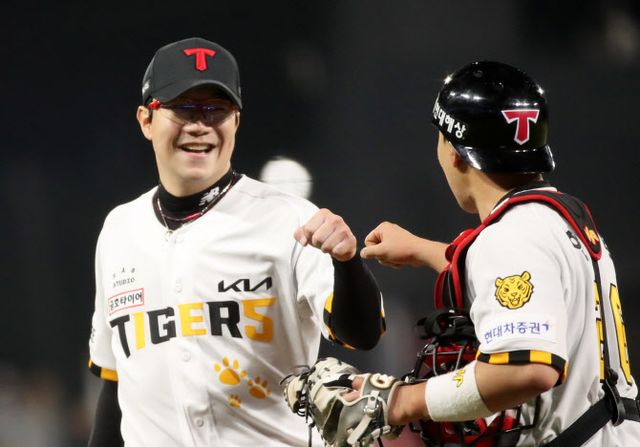 9일 광주기아챔피언스필드에서 열린 프로야구 SSG 랜더스와 KIA 타이거즈의 경기에서 KIA 양현종이 8회 무실점 투구를 마치고 포수 한승택과 주먹을 마주치고 있다. 사진=연합뉴스