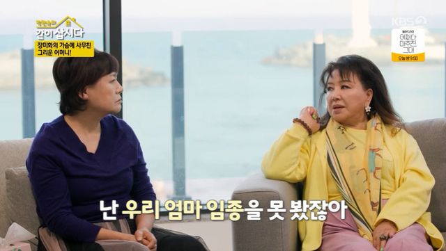 아직도 외동딸로서 임종을 지키지 못했던 것이 큰 한으로 남았다는 장미화는 생전 어머니와의 마지막 통화의 기억이 푹 내쉬는 한숨이었다며 슬퍼했다.