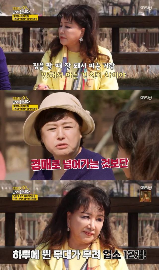 힘든 생활에 청담동 집마저 처분해야 했다는 장미화가 "잘 돼서 파는 거랑 망해서 파는 거랑 천지차이다"라고 우는 소리를 하자, 박원숙은 "팔고 가는 게 좋다. 경매로 파는 것보다는"이라고 말해 모두를 폭소케 했다.