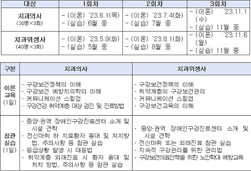 보건복지부(장관 조규홍)가 한국보건복지인재원(원장 배금주), 중앙장애인구강진료센터(센터장 금기연)와 함께 5월 9일(화)부터 11월 30일(목)까지 공공 구강보건의료 전문인력(치과의사, 치과위생사)을 대상으로 장애인, 노인 등 취약계층의 구강 건강관리 역량 강화를 위한 교육을 시행한다.