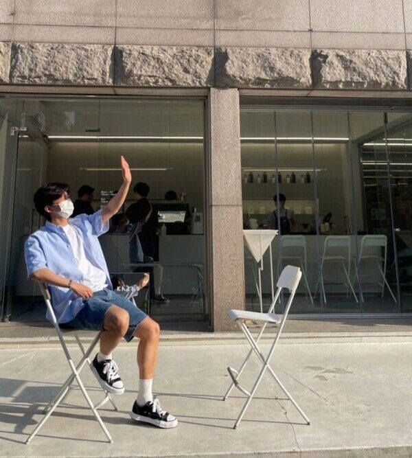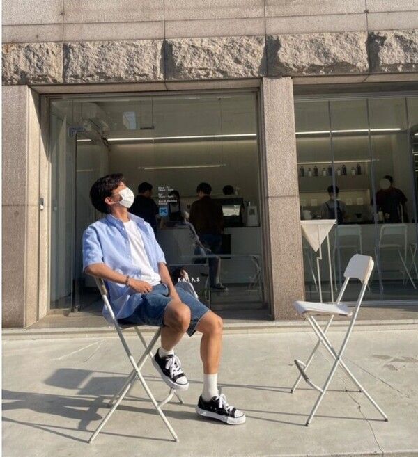 공개된 사진 속 임영웅은 한 카페의 야외 자리에 앉아있다. 그는 따뜻해진 날씨에 청반바지에 흰 티셔츠, 푸른색 반팔 셔츠, 스니커즈를 매치해 청량미 넘치는 남친룩을 완성했다.