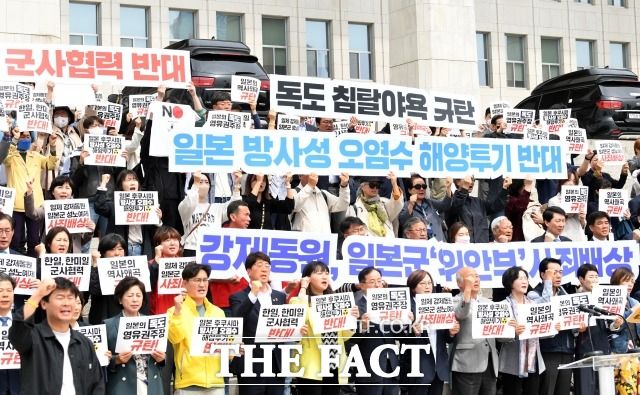 지난 4일 더불어민주당 등이 후쿠시마 오염수 방류 반대 피켓을 들어보이며 구호를 외치고 있는 모습. /남용희 기자