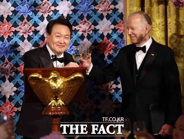 윤석열 대통령이 지난달 26일(현지시간) 워싱턴DC 백악관에서 열린 국빈만찬에서 조 바이든 미국 대통령과 건배를 하고 있는 모습. /뉴시스