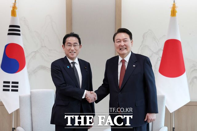 여야는 9일 기시다 후미오 일본 총리의 강제동원 피해자 발언을 두고 공방을 벌였다. 윤석열 대통령(오른쪽)과 기시다 총리가 지난 7일 대통령실 청사에서 악수하고 있는 모습. /대통령실 제공