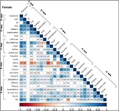 여성에서 자살(Suicide), 자해(Self-harm) 및 자살 위험인자 관련 단어들(성적, 학교폭력 등) 간의 상관성이 높았다.