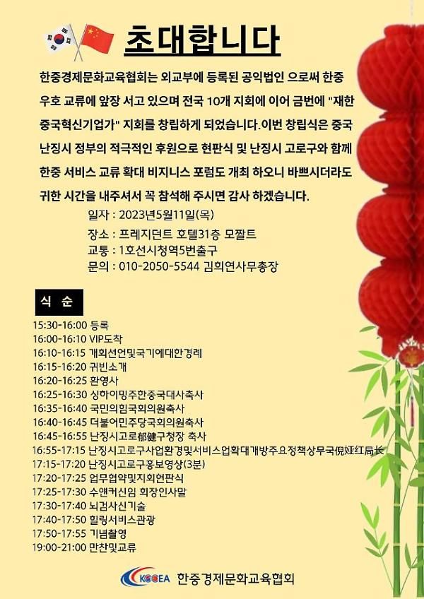 이번행사는 중국 난징시 정부의 적극적 후원으로 현판식 및 한중 서비스 교류확대 포럼도 함께 개최될 예정이다.