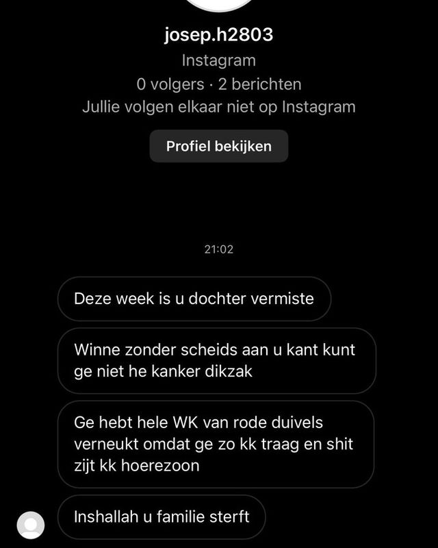 알데르베이럴트가 올린 메시지에는 “네 딸은 이번 주말에 죽을 것이다. 난 당신의 가족이 죽길 바란다. 심판 없이는 승리할 수 없는 거대한 암덩어리 같은 놈”이라고 적혀 있었다.