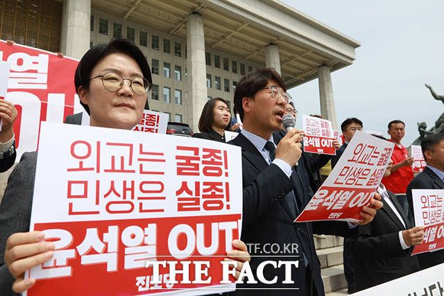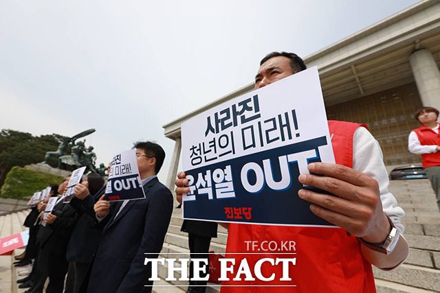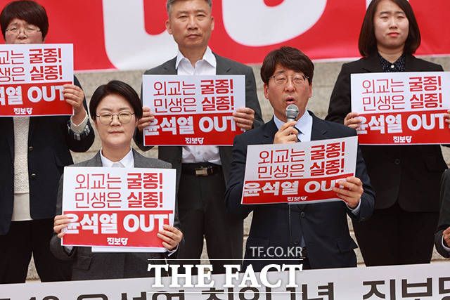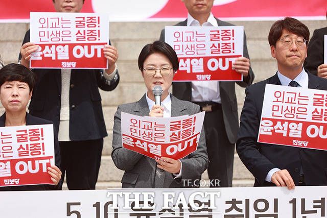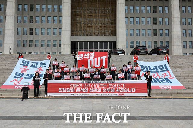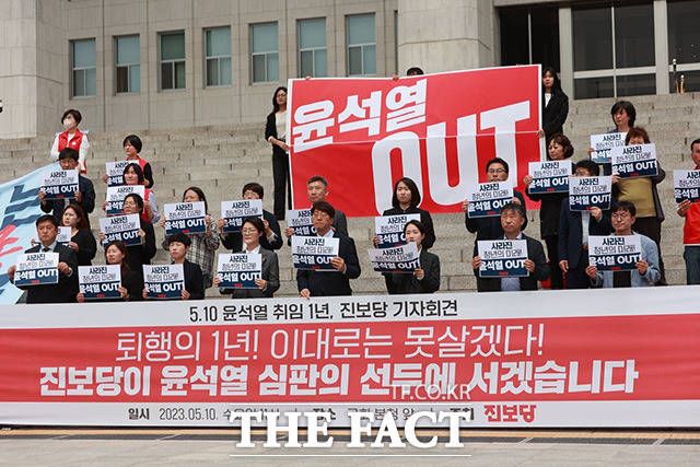 [더팩트ㅣ남용희 기자] 윤희숙 진보당 상임대표와 강성희 원내대표(아래 왼쪽 두 번째부터) 등 당원들이 10일 오전 서울 여의도 국회 본청 앞 계단에서 열린 '윤석열 취임 1년, 정권 심판 진보당 기자회견'에서 손피켓을 들어보이며 구호를 외치고 있다.