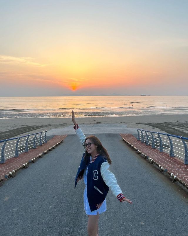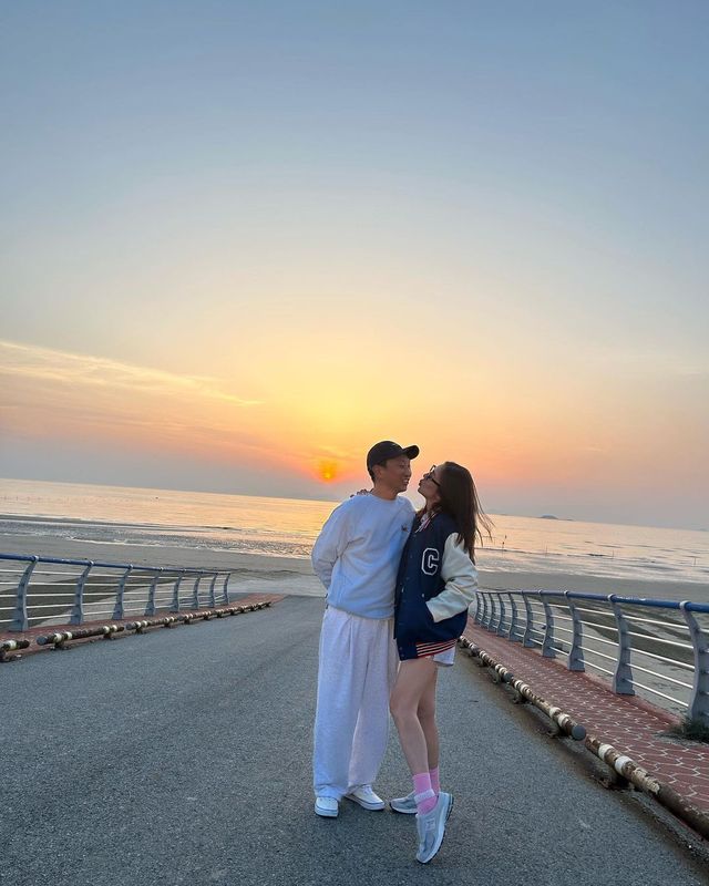 두 사람은 노을 지는 바다를 바라보며 데이트를 즐기고 있다. 밝게 웃는 부부 투샷이 보는 이들의 미소를 자아냈다.