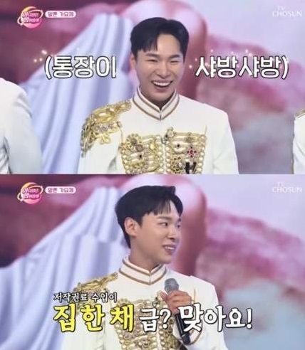 그러자 김지환은 "'샤방샤방'은 고3 때 만들었다. (군대에 다녀오니) 조그만 집 한 채를 살 수 있을 정도(로 쌓였다)"고 조심스럽게 답했다.