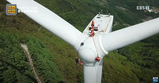 풍력발전기 날개 위에서 기술자들이 작업하고 있다. / EBS다큐, 유튜브