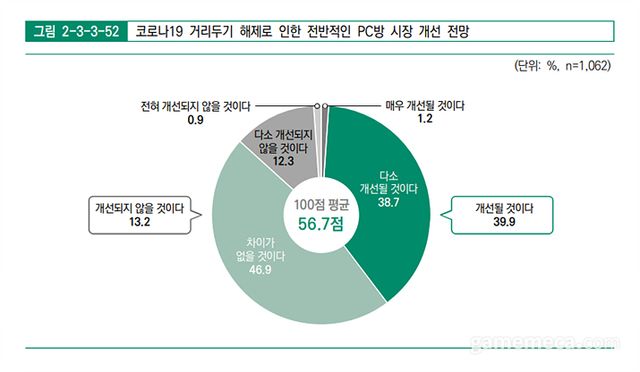 함께 진행된 ‘코로나19 거리두기 해제로 인한 전반적인 PC방 시장 개선 전망에 대한 조사’에는 전국 PC방 사업주 중 13.2%가 ‘개선되지 않을 것이다’에 응답했으며, 46.9%는 ‘차이가 없을 것이다’라고 답했다. 이는 거리두기 해제 이후로도 정상화가 힘들 것이라 판단한 사업주가 약 60%에 달함을 뜻한다.