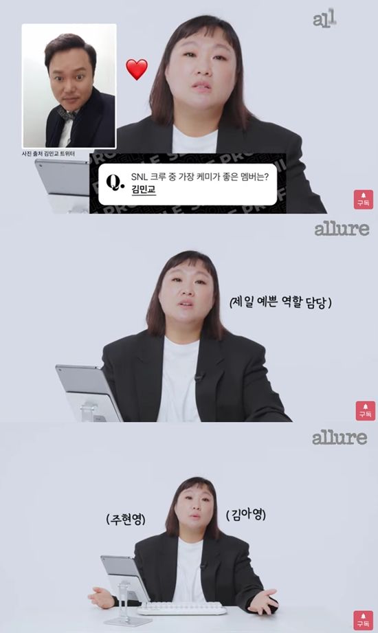 또한 "SNL 크루 중 가장 궁합이 좋은 멤버"를 묻자, 이수지는 함께 커플 연기를 많이 한 김민교를 꼽았다.
