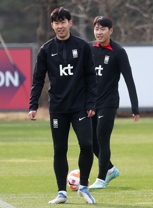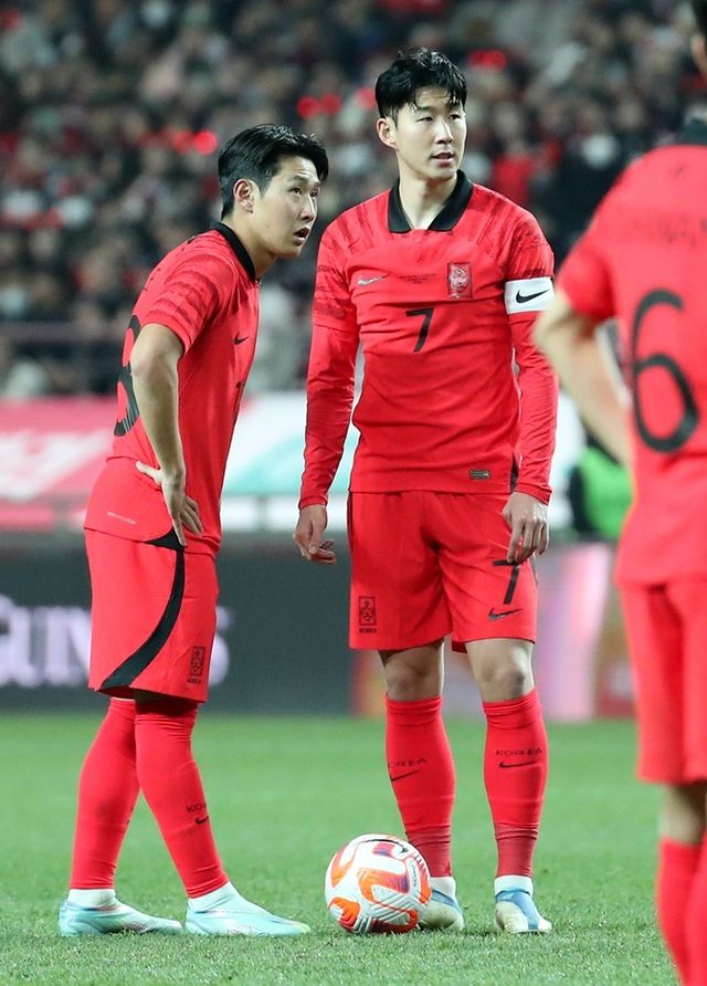 지난 3월 28일 서울 마포구 서울월드컵경기장에서 열린 축구 국가대표 평가전 대한민국-우루과이 경기에서 대화 중인 손흥민과 이강인