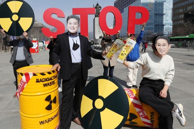 지난 3월 서울 종로구 광화문광장에서 열린 '세계 물의날 기념, 후쿠시마 방사능 오염수 해양투기 반대 캠페인'. 일본 후쿠시마 원전 오염수 방류에 반대하는 환경보건시민센터 관계자들이 퍼포먼스를 하고 있다. / 뉴스1