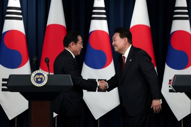 방한한 기시다 후미오 일본 총리가 지난 7일 서울 용산 대통령실 청사에서 윤석열 대통령과 악수하고 있다. / 뉴스1-대통령실