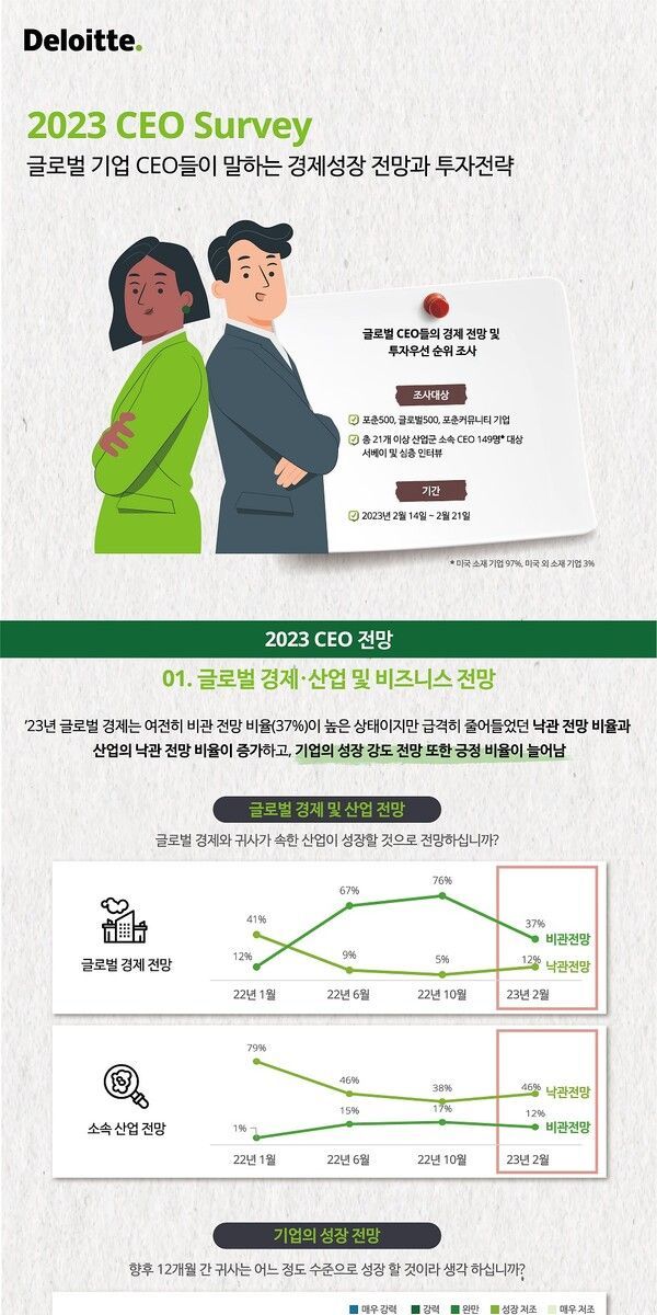 한편, 한국 딜로이트 그룹이 발간한 ‘윈터 2023 포춘/딜로이트 CEO 서베이’ 국문본 전문은 딜로이트 홈페이지(Link) 혹은 딜로이트 인사이트 앱을 통해 확인할 수 있다.