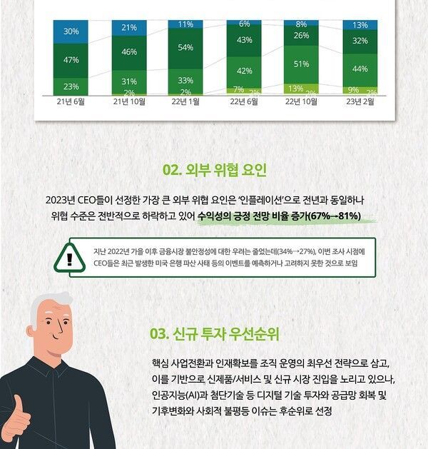 글로벌 CEO들은 2023년 비즈니스 키워드를 ‘글로벌 경기 회복의 희망과 기대로 재도약을 위한 새로운 사업 기회 탐색’으로 정의했다. 이는 지난해 비즈니스를 평가한 ‘경기회복 지연과 불확실성이 증가한 사업환경에서 공급망 회복과 디지털 전환으로 극복 추진’과 비교할 때 올해는 ‘낙관과 새로운 기회 탐색’으로 태도를 전환한 셈이다.