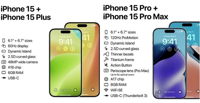 다음으로 아이폰 15 프로 시리즈는 다이나믹 아일랜드, 120Hz 화면 주사율, 티타늄 프레임, A17 칩셋, 8GB 램 탑재가 된다. 프로맥스 모델 카메라는 최대 6배 광학 줌이 지원되며 일반 모델과 프로 모델 모두 충전 방식은 USB-C 타입으로 변경된다.