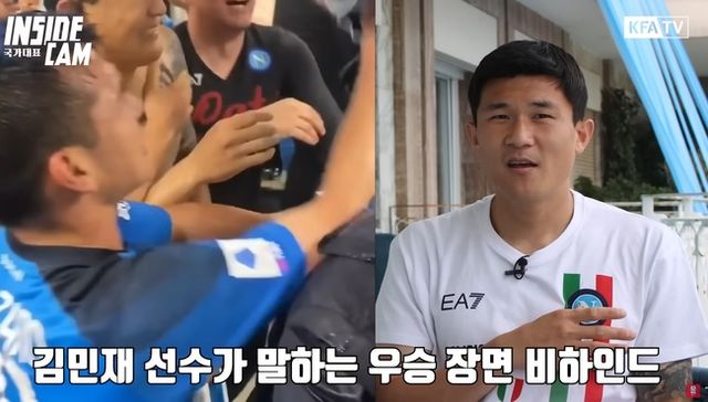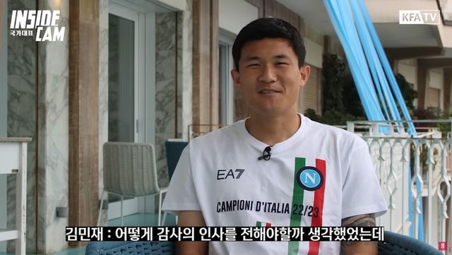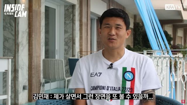 대한축구협회(KFA)는 11일 "위르겐 클린스만 감독 제안에 따라 KFA '인사이드캠' 촬영팀이 최근 나폴리 현지를 찾아가 소속팀 나폴리의 이탈리아 세리에A 우승에 기여한 김민재 선수를 만나고 왔다"라고 소개했다.