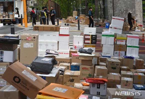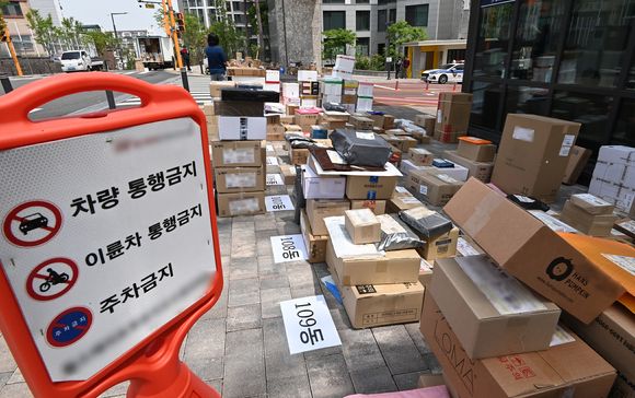 [아이뉴스24 원성윤 기자] 경기도 수원시의 한 대단지 아파트에서 택배 차량의 지상 출입을 전면 금지하자 택배 기사들이 아파트 정문에 택배 물품을 갖다 놓으면서 '택배 대란'이 벌어지고 있다. 지하주차장 높이(2.5m) 때문에 벌어진 일인데 아파트 측에서는 "된다"는 입장을, 택배사에서는 "안 된다"며 갑론을박이 벌어지고 있다.