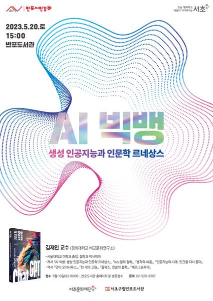 서울 서초구(서초구청장 전성수)와 서초문화재단(대표 강은경), 서초구립반포도서관(관장 전승희)은 오는 20일 반포도서관에서 반포시민강좌 ‘AI빅뱅: 생성 인공지능과 인문학 르네상스’라는 주제로 강연을 마련했다고 12일 밝혔다.