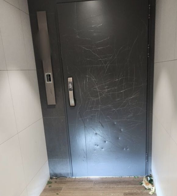 당시 여행을 떠난 상태였던 집주인 B씨는 휴대전화 앱을 통해 초인종이 계속 눌려지고 있는 사실을 확인했으며 지난 8일 여행에서 돌아와 난도질된 현관문과 깨진 채 널브러진 소주병들 등을 확인했다.