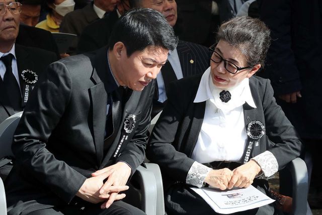 박근령 전 육영재단 이사장과 신동욱 전 공화당 총재가 2022년 10월 26일 동작구 국립서울현충원 박정희대통령 묘역에서 열린 박정희 대통령 43주기 추도식에서 대화를 나누고 있다. / 뉴스1