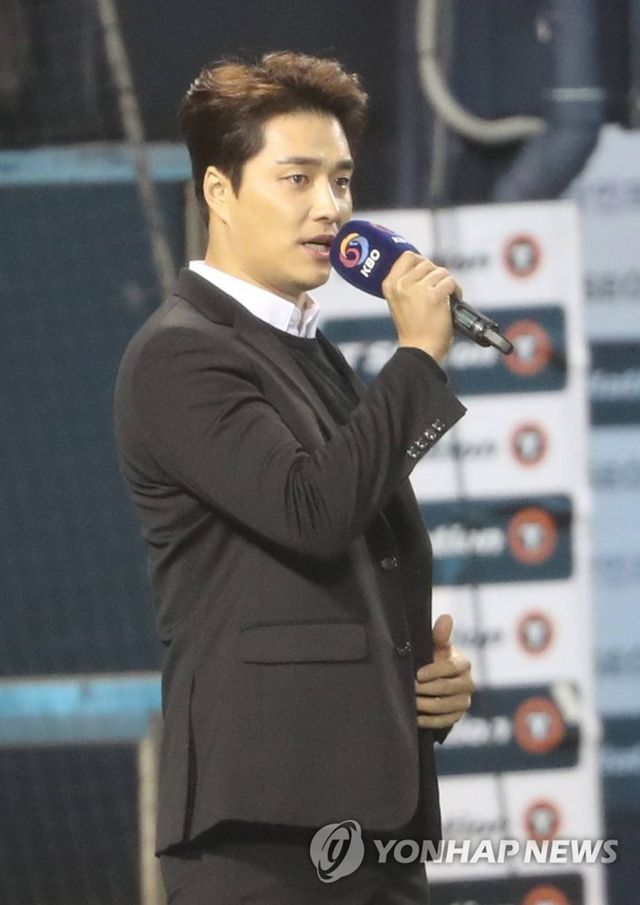 뮤지컬 배우 민우혁이 2018년 11월 12일 잠실야구장에서 한국시리즈 SK-두산 6차전 애국가를 부르고 있다. / 연합뉴스