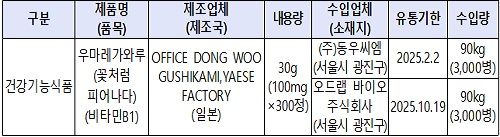 회수 대상은 ‘(주)동우씨엠(서울시 광진구 소재)’, ‘오드랩 바이오 주식회사(서울시 광진구 소재)’가 수입∙판매한 제품으로 유통기한이 2025년 2월 2일, 2025년 10월 19일로 표시된 제품이다.