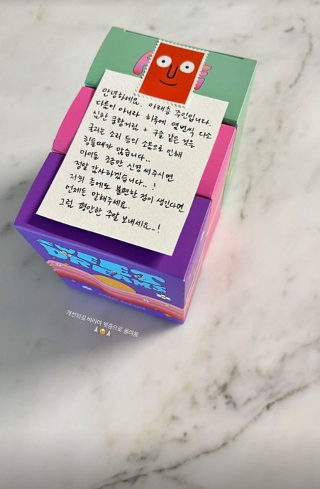 효민이 직접 쓴 쪽지에는 "안녕하세요. 아래층 주민입니다. 다름이 아니라 하루에 몇 번씩 다소 심한 쿵쾅거림 + 구슬 같은 것을 굴리는 소리 등의 소음으로 인해 힘들 때가 많습니다"라고 적혀 있었다.