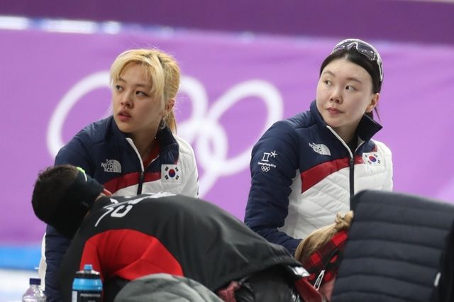 김보름(좌)과 노선영이 2018 평창동계올림픽 스피드스케이팅 여자 팀추월 순위 결정전을 마친 뒤 휴식을 취하고 있다. /이하 뉴스1