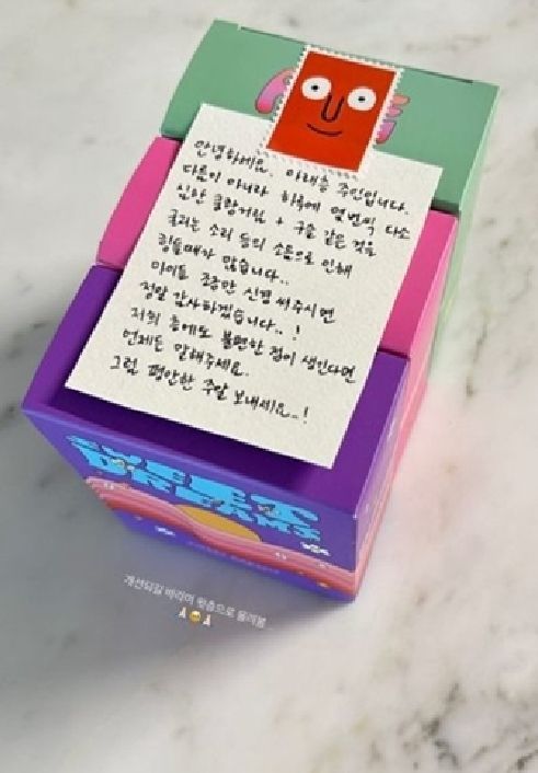공개된 사진에는 작은 선물 상자와 함께 "안녕하세요, 아래층 주민입니다. 다름이 아니라 하루에 몇 번씩 다소 심한 쿵쾅거림+구슬 같은 것을 굴리는 소리 등의 소음으로 인해 힘들 때가 많습니다"라고 시작하는 글이 눈에 들어온다.