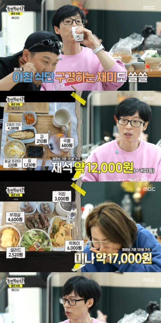 이후 멤버들은 다 함께 식사했고, 유재석은 "각자 아침 어떻게 먹는지 보는 것도 재미있다"라며 기뻐했다. 제작진은 "재석 형이 만이천 원, 미주가 사천 원 정도. (신봉선이) 만칠천 원 정도"라며 귀띔했다.