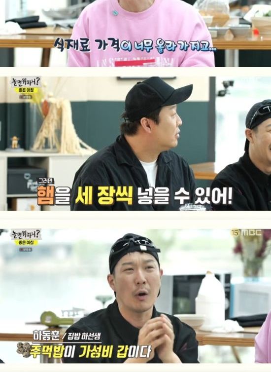 정준하는 "이 돈으로 하려면 사실 (유재석) 네가 돈을 많이 보태야 한다. 햄을 세 장씩 넣을 수 있다"라며 너스레를 떨었다.