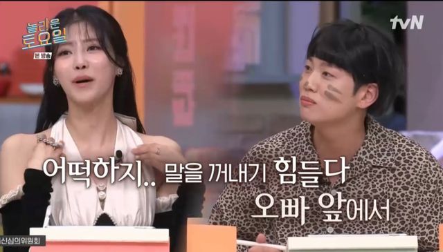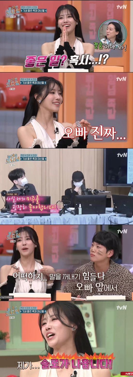 미주는 "어떡하지. 오빠 앞에서 말을 꺼내기 힘들다"고 계속해서 망설이더니 "제가 솔로가 나온다"고 급 홍보를 해 웃음을 안겼다.