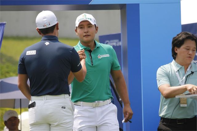 서요섭(27, DB손해보험)이 13일 3라운드 1번 홀 티잉그라운드에서 같은 조 이재경(24, CJ)과 반갑게 인사를 나누고 있다.