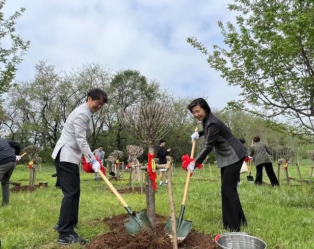 韩国驻沈阳总领事馆领事崔喜德(左)与辽宁省外事办公室主任兼人民对外友好协会会长罗丽共同种下无穷花树。【图片提供 韩联社】