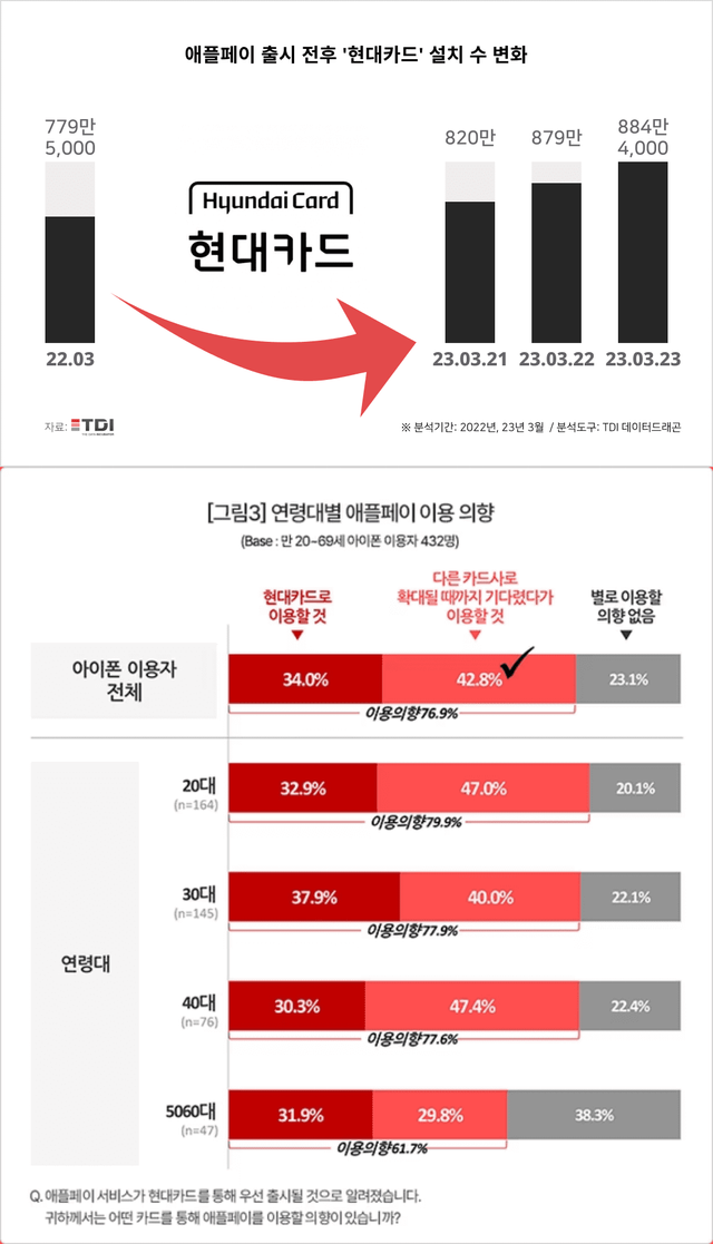 2023년 2월, 소비자 설문 조사 업체인 컨슈머인사이트의 조사에 따르면 국내 아이폰 이용자 중 42.8%가 다른 카드사 확대를 기다렸다가 애플페이를 이용하겠다고 응답했습니다. 상황이 이렇다보니 다른 카드사들도 오픈페이 시장 확대에 주력하기 보다는 애플페이와의 제휴를 염두에 둘 수밖에 없는 상황입니다.