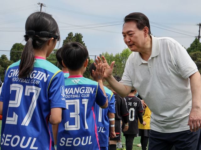 어린이 축구 선수들 격려하는 윤석열 대통령