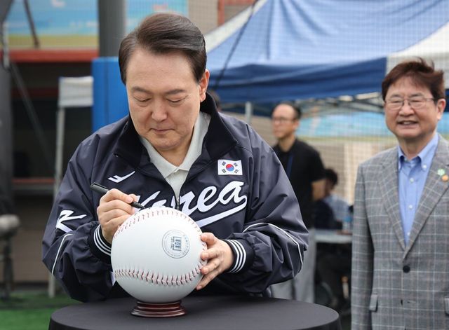 국가대표 야구팀과 점퍼를 입고 그라운드에 들어선 윤 대통령은 결승에 오른 양 팀 주장 선수와 감독에게 기념 모자와 꽃다발을 전달했다. 또 대형 야구공에 친필 사인을 하기도 했다.