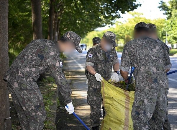 장병들이 도로변과 해안가를 따라 태풍으로 발생한 쓰레기와 나뭇가지 등 잔해물을 수거하는 자료 사진 / 뉴스 1