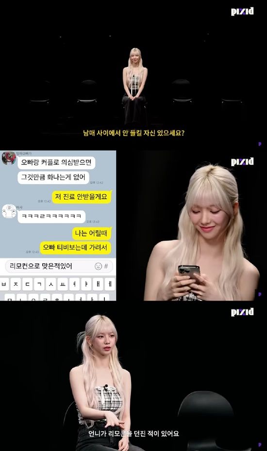 이내 카리나는 "나는 어릴 때 티비 보는데 가려서 리모컨으로 맞은 적 있다"라고 답했다. 카리나는 "이건 있었던 일이다. 언니가 TV 보고 있는데 옆에서 '안 보이지?' 해서 언니가 리모컨을 던졌다. 그걸 떠올려서 대입해 봤다"라고 설명했다.