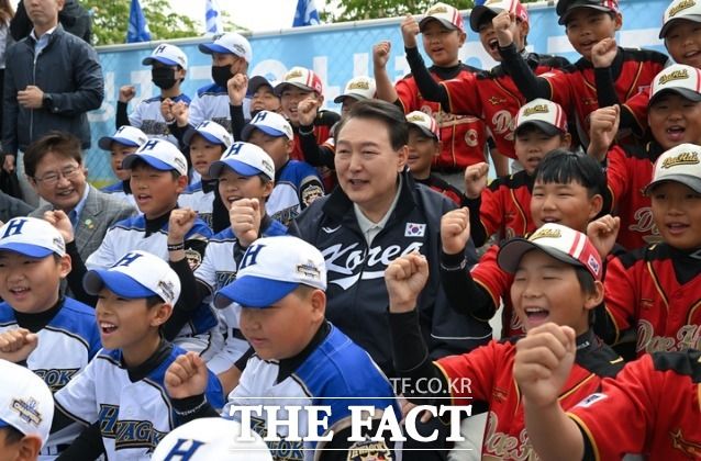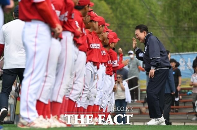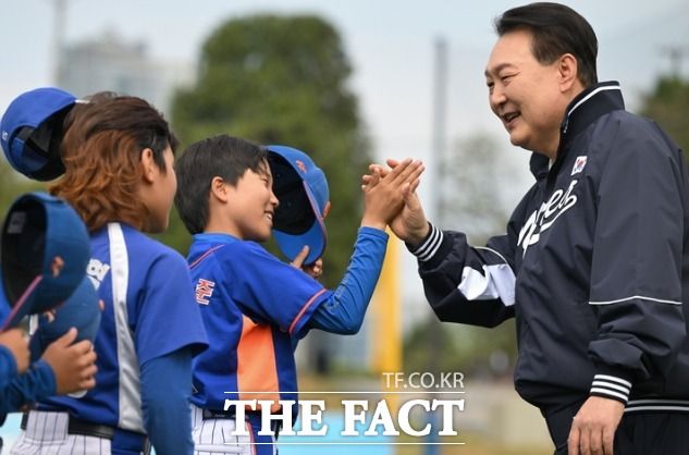 [더팩트ㅣ이효균 기자] 윤석열 대통령이 14일 서울 용산어린이정원 스포츠필드에서 열린 '2023 대통령실 초청 전국 유소년 야구·축구대회' 현장을 방문했다.