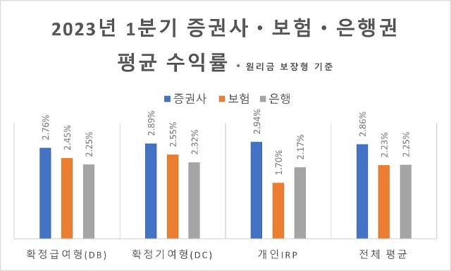 14일 금융감독원 공시에 따르면 올해 1분기 증권사들은 퇴직연금 전 부문에서 보험·은행권 대비 높은 수익률을 기록했다. 확정급여형(DB)에서 총 12개 증권사가 원리금 기준 평균 2.76% 수익률을 거뒀다. 확정기여형(DC)에서는 증권사 13곳이 평균 2.89% 수익률을 냈다. 개인형(IRP)에서는 14개사가 평균 수익률 2.94%를 달성했다. 반면 보험·은행업계 전 부문 평균 수익률은 1~2% 초중반대에 그쳤다.